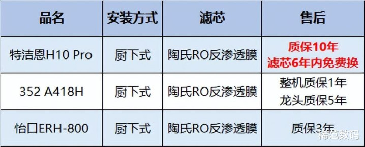在这里我选了三款比较主流的品牌来横测对比下,前面说了,一般建议选用厨下式安装的净水器,因此售后服务相当重要,目前来说大部分的厂家都提供了免费上门的安装服务,不过在售后质保上差异较大,如特洁恩H10 Pro提供了10年的质保,并且6年内滤芯更换全免费,这服务含金量相当之高,必须要重点考虑。