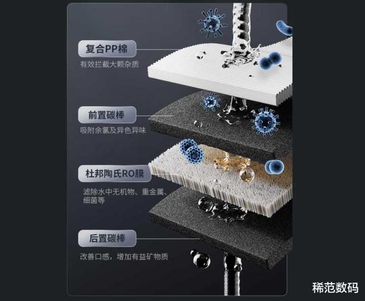 过滤效果最好的就是反渗透过滤,可过滤掉0.1到1纳米的污染物,这个级别,就是病毒都不放过,直接过滤,毕竟,病毒的尺寸大都在20-300纳米。没错,反渗透滤芯可以过滤掉除水分子外几乎所有的污染物,连病毒都不放过。它过滤出来的水质,纯净卫生可直接饮用。