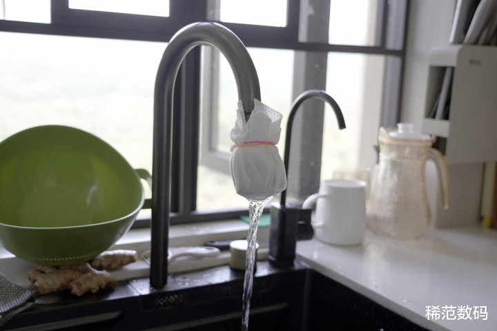 3,用在水龙头出水口安装简单的棉质口罩进行简单的过滤,使用一周后取下口罩查看口罩的污染情况,如果明显看到发黄脏污,说明水质较差,需要安装净水器过滤。